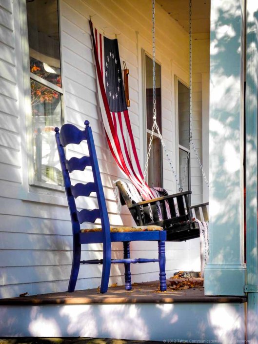 An American porch… without a doubt. The glow on the ceiling is a bounce from all the yellow leaves in the yard. I wanted to sit and watch the day go by.