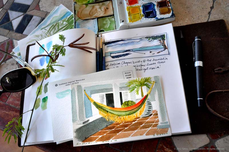 A definite change… still, warmer, humid, mosquitos! Hearing things you don’t hear when the breeze is running… the dog down the hill… a carpenter cutting wood somewhere far off. Preceded by a night of wind and rain that rattled the shutters, the sunrise sky is like none we’ve seen since we arrived. I’ve amused myself with my watercolor postcards, finding hidden pictures on the tiles of the floor and pool lounging when the sun is not quite so high. I’m getting the hang of the watercolors. I’ve never liked the medium… I’m too impatient and tend to overwork a piece by not letting the color dry before I work on top of it. The breeze here taught me something. It helped dry things up and I could see that I had to wait. Learn something every day… try new stuff… keep those brain cells moving… :)))