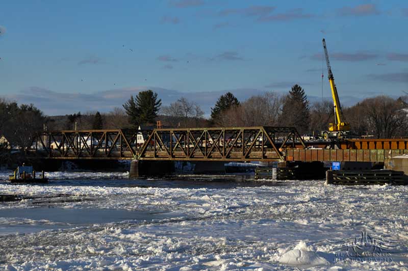 So, as I drove away along the south side of the river, I noticed that the river was clogged with ice from the recent cold temperatures and covered with the heavy snowfall of the weekend ‘Nemo’ storm. I stopped to capture an image or two of the ice and the construction site under the two side by side bridges. I began to wonder if the amount of ice and the forces it could bear on the barges holding 3 enormous cranes for the construction companies could be a potential problem… when a strange craft came from under the bridges and proceded to push the ice around. As it did, the floes drifted away from the big ice pack and floated harmlessly down the river past the barges. An Ice-breaker! Round and round it went clearing the ice from the river while comuters traveled across the old Bates Bridge north and south… home from work to Haverhill or Groveland on either side… oblivious to the work going on below on the river.